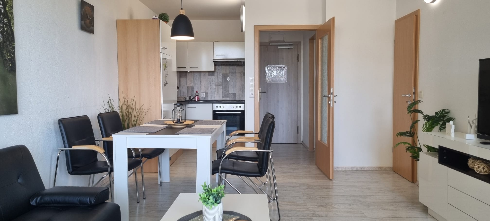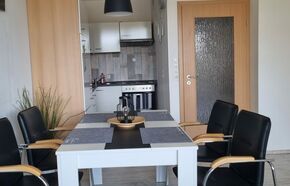 Komfortabel ausgestattete, Nichtraucher- Ferienwohnung mit einem Schlafraum mit Doppelbett (1,60 x 2,00 m) und Stockbett für die Kinder im zweiten Schlafraum, schicke neue Küche, Essecke und Wohnraum mit bequemer Sitzgarnitur. Der Wohn-und Schlafbereich ist mit Laminatboden ausgestattet.